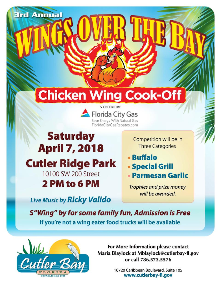 april, 2018 Wings Over The Bay Cutler Ridge Park 10100 SW 200 Street 07apr2:00 pm6:00 pmWings Over The BayChicken Wing Cook-Off Event Details Event Details Time (Saturday) 2:00 pm - 6:00 pm LocationCutler Ridge Park 10100 SW 200 Street CalendarGoogleCal 0 replies Leave a ReplyWant to join the discussion? Feel free to contribute! Leave a Reply Cancel reply Your email address will not be published. Required fields are marked *Comment Name * Email * Website